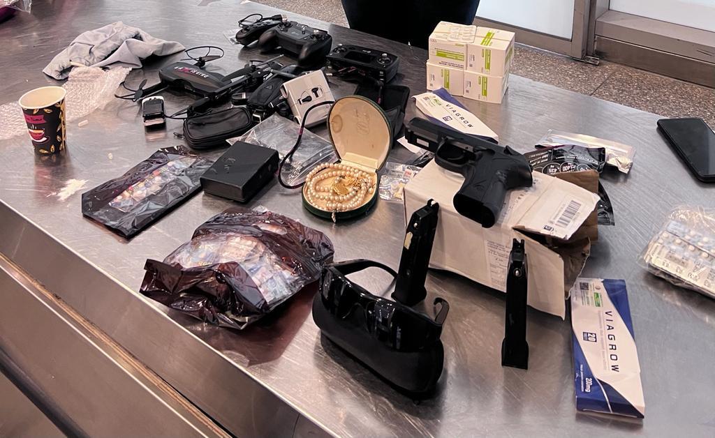 وقد اسفر التفتيش عن ضبط طبنجة واثنين خزنة خاصتين بها، واثنين طائرة مزودين بكاميرات تصوير بالريموتات الخاصة بها و25 ريشه اضافية خاصة بالطائرتين وكاميرا مراقبة علي شكل دبوس جاكيت ونظارة شمسية مزودة بكاميرا للتصوير ونظارة ميدان افاد تقرير المقدم عمرو نجم من ادارة شرطة الخدمة المدنية(المفرقعات) انهم محظور حيازتهم طبقا للقانون ارقام 216 لسنة 2017 ولقرار الحاكم العسكري رقم 3 لسنة 1998 و كاميرا صغيرة لتصوير المستندات افاد التقرير انه يلزم لدخولها البلاد الحصول على تصريح من مصلحة الامن العام و8 كروت ذاكرة كما تم ضبط 40 شريط من عقار الترامادول المخدر باجمالي 400 قرص و20 بذرة لنبات الماريجوانا المخدر و3 انبوبة زجاجية تستخدم في تعاطي المخدرات، شارك في الضبط كل من السيد احمد موسي ونورهان محمد فؤاد مامورا الجمرك وتامر عادل رئيس القسم.