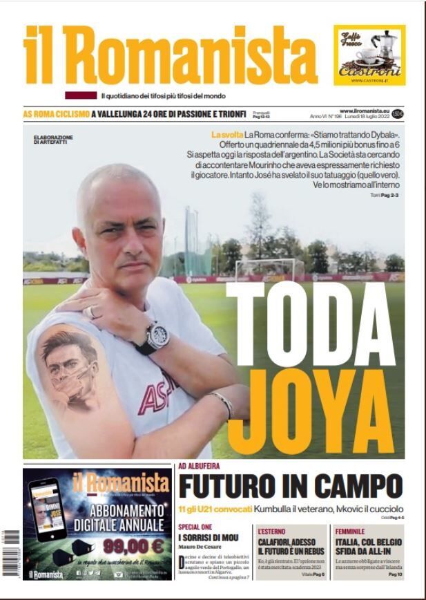 تصدر وشم البرتغالي جوزيه مورينيو مدرب فريق روما الإيطالي، غلاف الصحيفة لعدد اليوم، والذي قام برسمه مؤخرًا بكؤوس دوري أبطال أوروبا والدوري الأوروبي ودوري المؤتمر؛ باعتباره المدرب الوحيد الفائز بذلك، ولكن بدلت الصحيفة صورة الكؤوس بصورة الأرجنتيني باولو ديبالا؛ باعتباره قريبًا من الانضمام لفريق الذئاب أكثر من أي وقت مضى.