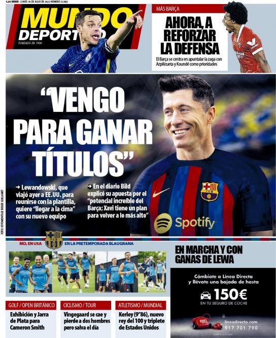 سلطت موندو ديبورتيفو في غلافها، الضوء، على انضمام ليفاندوفسكي إلى برشلونة، وقالت لإن اللاعب يريد الوصول إلى قمة المجد مع الفريق الكتالوني.