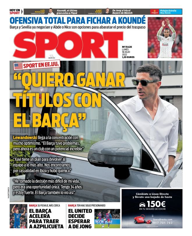 تصدر البولندي روبرت ليفاندوفسكي لاعب فريق برشلونة، الوافد الجديد، غلاف صحيفة سبورت لعدد اليوم، حيث قالت إن ليفاندوفسكي يريد أن يفوز بالألقاب مع برشلونة.