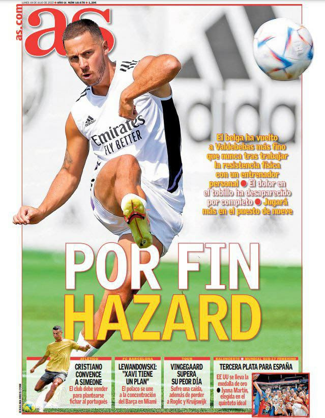 كشفت صحيفة آس الإسبانية، في غلافها، مساعي كريستيانو رونالدو للعودة إلى الدوري الإسباني عن طريق بوابة نادي أتلتيكو مدريد، حيث قالت إن رونالدو عرض نفسه على النادي، ويقنع دييجو سيميوني مدرب الفريق بذلك الأمر.