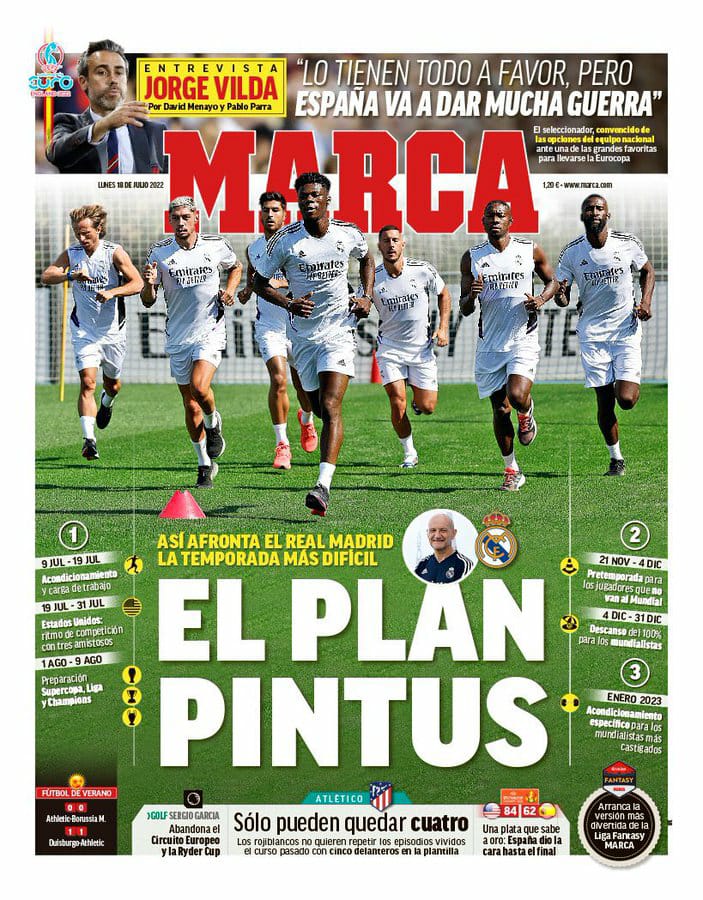 سلَّطت ماركا في غلافها، الضوء، على برنامج القوة واللياقة البدنية للاعبي ريال مدريد، حيث قالت إن بينتوس، مدرب الأحمال للفريق الميرينجي، لديه خطة كاملة قبل انطلاق الموسم لمضاعفة اللياقة البدنية.