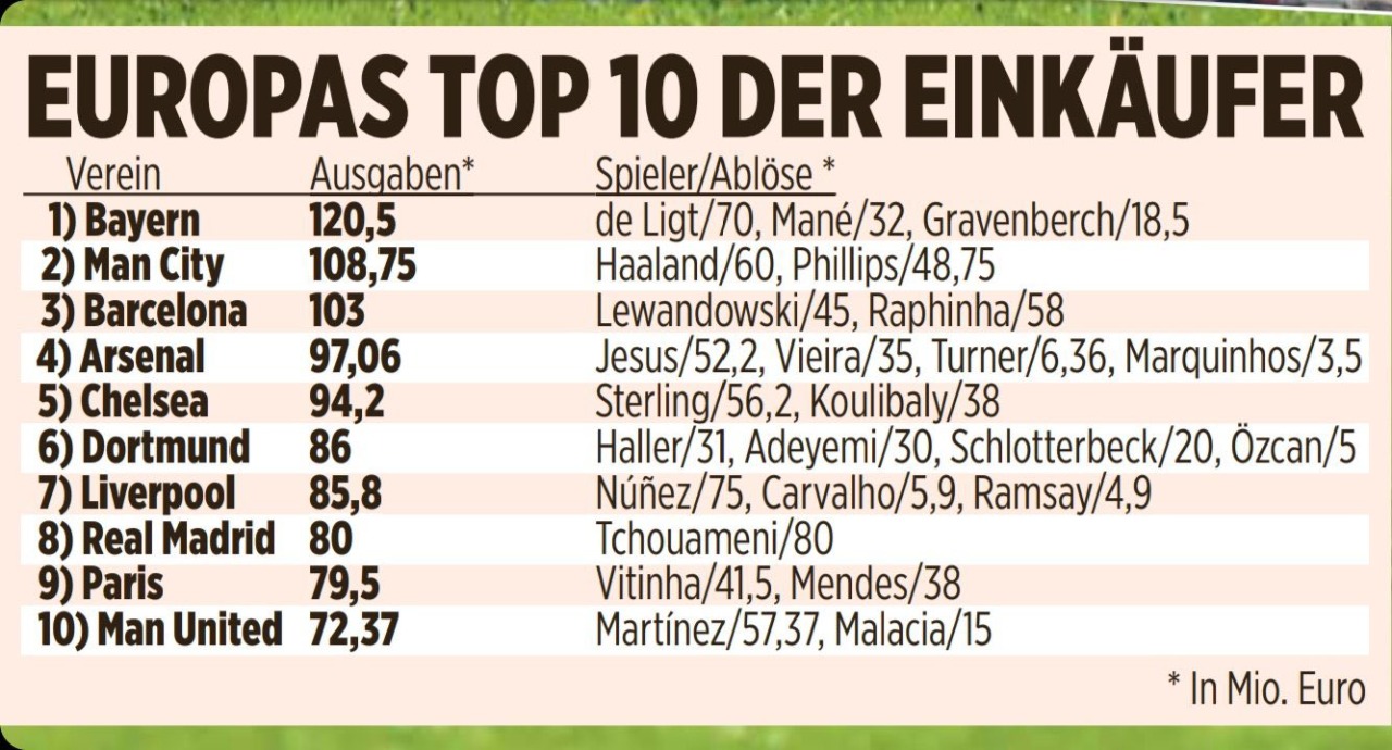 ووفقًا للمعلومات الواردة من صحيفة بيلد الألمانية، فإن بايرن ميونخ هو أكثر نادي أوروبي أنفق الأموال على التعاقدات الجديدة حتى الآن هذا الصيف.