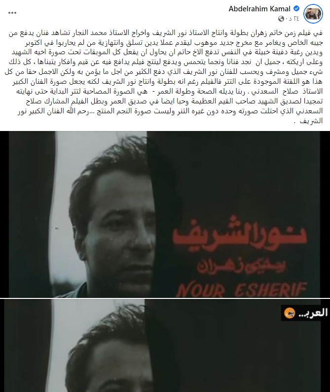 واختتم عبد الرحيم كمال، قائلا: تمجيدًا لصديق الشهيد صاحب القيم العظيمة، وحُبًا أيضًا في صديق العمر، وبطل الفيلم المُشارك صلاح السعدني، الذي احتلت صورته وحده دون غيره التتر، وليست صورة النجم المنتج.. رحم الله الفنان الكبير نور الشريف.