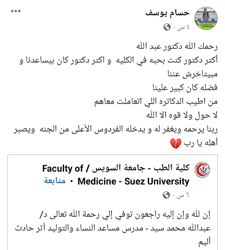 بعبارات مؤثرة وحزينة، عبر طلاب كلية الطب بجامعة السويس، عبر صفحاتهم الشخصية على موقع التواصل الاجتماعي، عن حزنهم الشديد إثر إعلان خبر وفاة الدكتور عبدالله محمد سيد، مدرس مساعد النساء والتوليد بالكلية، وابن قرية درنكة بمحافظة أسيوط، والذي لقي مصرعه صباح اليوم، في حادث تصادم أتوبيس سوبر جيت بسيارة نقل ثقيلة واقفة على الطريق الصحراوي الشرقي بالمنيا.