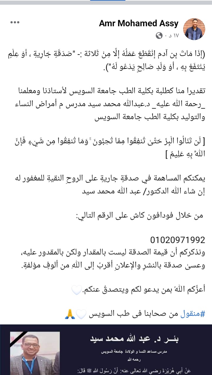 ودشن طلاب وطالبات كلية الطب بجامعة السويس، حملة لجمع التبرعات لتنفيذ صدقة جارية على روح الدكتور عبدالله محمد سيد، وتم الإعلان عنها عبر صحفة اتحاد طلاب كلية الطب بجامعة السويس، والصفحات الشخصية للطلاب وتضمنت الأتي: إِذَا مَاتَ بِن آدم انقطع عَمَلُهُ إِلَّا مِنْ ثَلاثة:- "صَدَقَةٍ جَارِيةٍ، أَوْ عِلْمٍ يُنْتَفَعُ بِهِ، أوْ وَلَدٍ صَالِحٍ يَدْعُو لَهُ"، تقديرا منا كطلبة بكلية الطب جامعة السويس لأستاذنا ومعلمنا رحمة الله عليه، دكتور عبدالله محمد سيد، مدرس مساعد أمراض النساء والتوليد بكلية الطب جامعة السويس، يمكنكم المساهمة في صدقةٍ جاريةٍ على الروحِ النقيةِ للمغفور له إن شاء الله الدكتور عبد الله محمد سيد، ونذكركم أن قيمة الصدقة ليست بالمقدار ولكن بالمقدور عليه، وعسىٰ صدقة بالنشرِ والإعلانِ أقربُ إلى اللهِ من ألوفٍ مؤلفةٍ، أعزَّكم اللهُ بمن يدعو لكم ويتصدق عنكم.