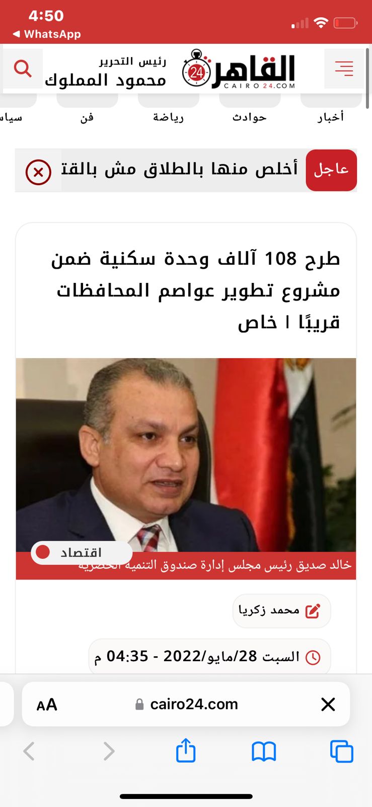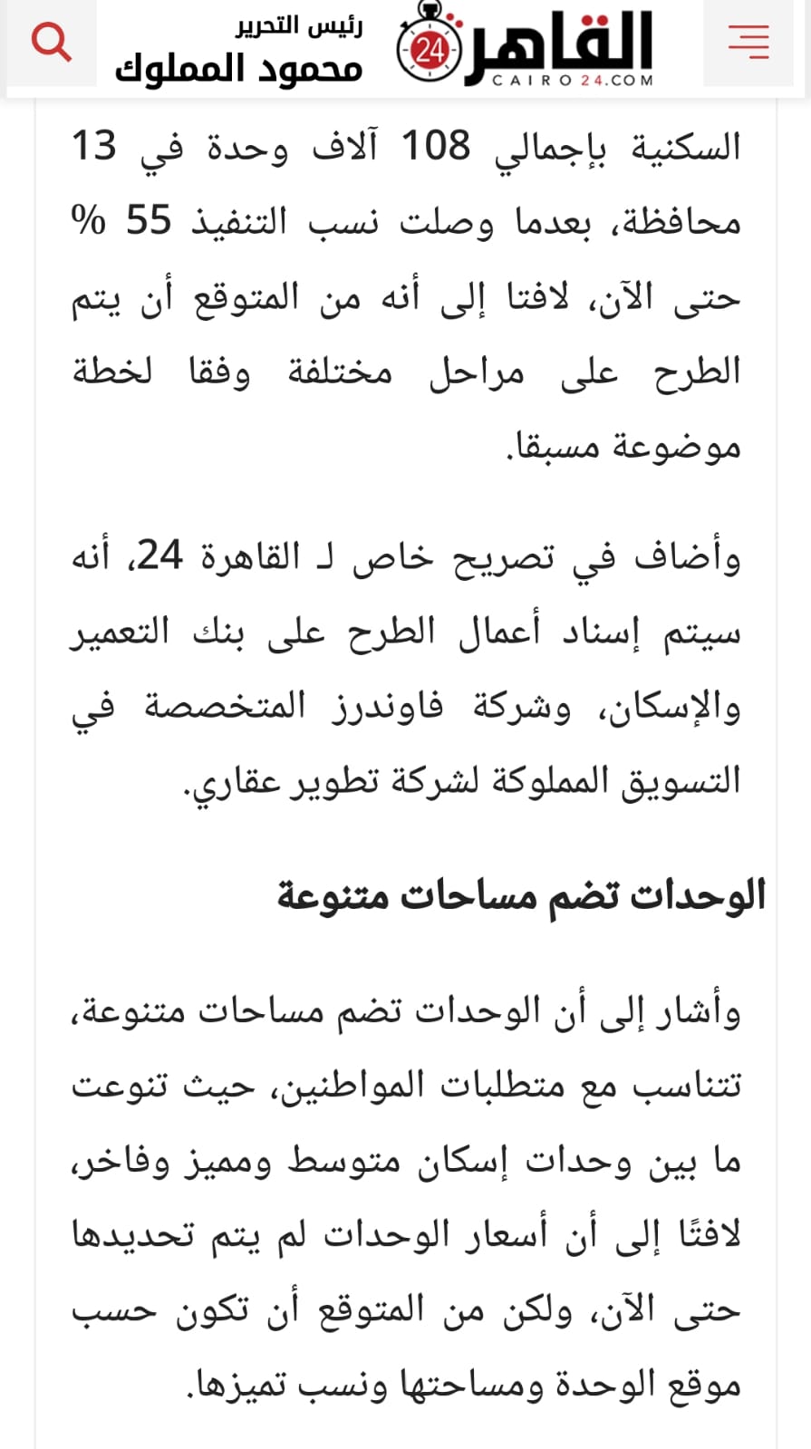 وكان القاهرة 24، انفرد بخبر نشر في 28 مايو الماضي وفق تصريحات خاصة لـ المهندس خالد صديق، رئيس مجلس إدارة صندوق التنمية الحضرية، أنه سيتم إسناد أعمال طرح المرحلة الأولى والعاجلة من الوحدات السكنية بمشروع عواصم المحافظات على بنك التعمير والإسكان، وشركة فاوندرز المتخصصة في التسويق المملوكة لشركة تطوير عقاري.