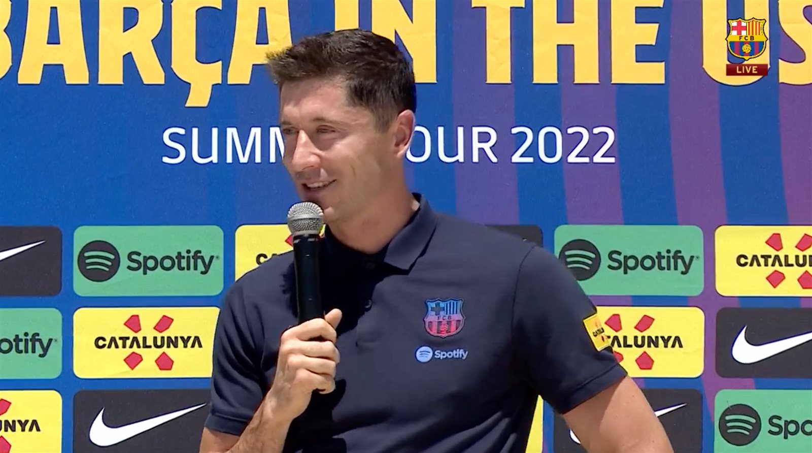 وقال ليفاندوفسكي خلال تقديمه كلاعب لـ الفريق الكتالوني: اسمي روبيرت، أنا من بولندا، وأعيش في برشلونة، وسعيد بوجودي هنا.