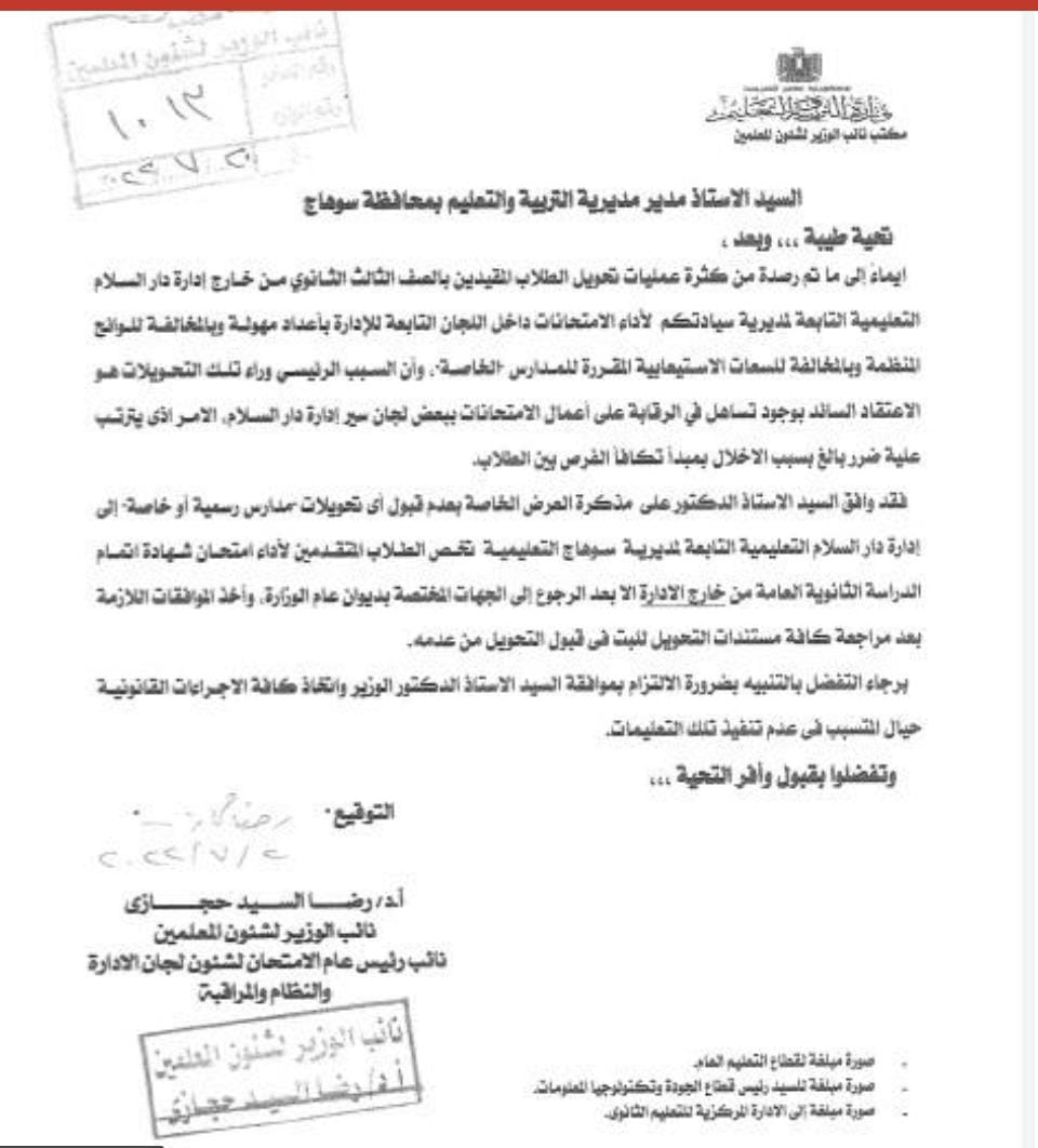 وجهت وزارة التربية والتعليم والتعليم الفني، خطابًا، إلى مديرية التربية والتعليم بمحافظة سوهاج، بشأن عدم قبول أي تحويلات لمدارس خاصة أو رسمية، إلى إدارة دار السلام التعليمية بمحافظة سوهاج، من الطلاب المتقدمين لأداء امتحانات الثانوية العامة من خارج الإدارة؛ إلا بعد العودة إلى الجهة المختصة بديوان عام وزارة التربية والتعليم والتعليم الفني