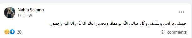 وكتبت نهلة سلامة، منشورًا عبر حسابها الشخصي بموقع التواصل الاجتماعي فيسبوك، وقالت: حبيبتي يا أمي وعشقي وكل حياتي الله يرحمك ويحسن إليك إنا لله وإنا إليه راجعون.