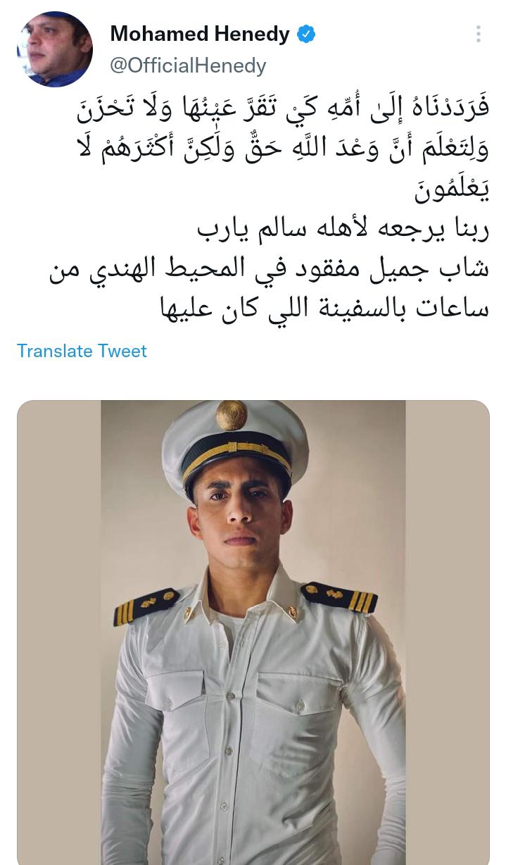 وتابع محمد هنيدي: مطالبا الجمهور بالدعاء له: ربنا يرجعه لأهله سالم يا رب.. شاب جميل مفقود في المحيط الهندي من ساعات بالسفينة اللي كان عليها.