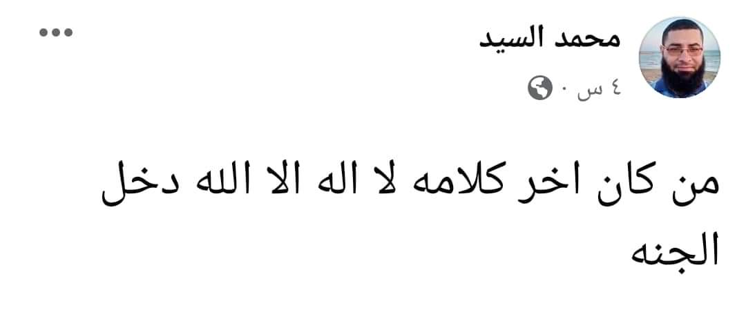 من كان آخر كلامه لا إله إلا الله دخل الجنة.. بتلك الكلمات اختتم محمد السيد زلط 35 عاما، أخصائي التحاليل الطبية، وابن قرية كوم الفرج التابعة لمركز أبو المطامير بمحافظة البحيرة، حياته حيث كتبها عبر حسابه الشخصي على موقع التواصل الاجتماعي فيس بوك وتوفي بعدها بساعات قليلة.