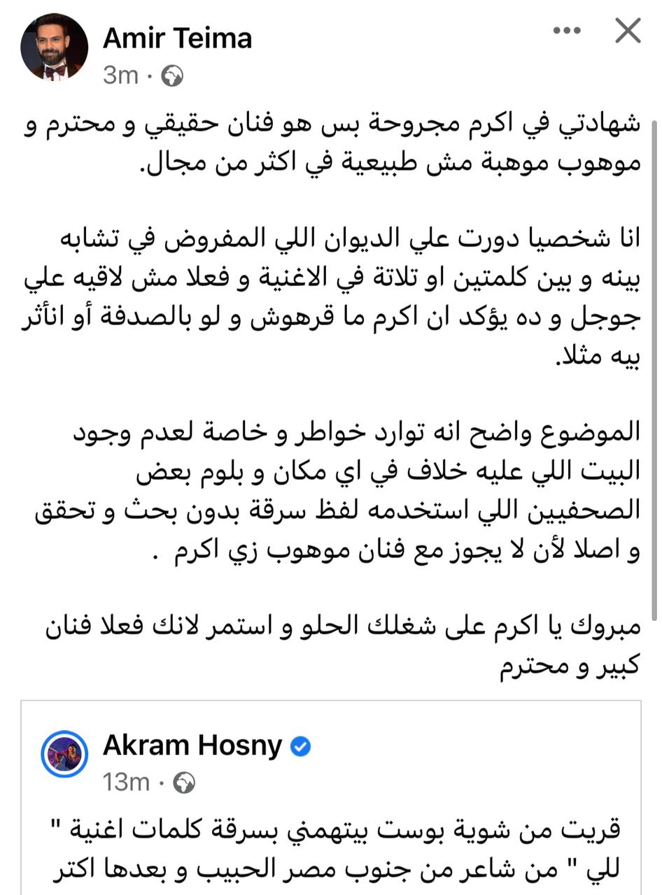 وواصل طعيمة: الموضوع واضح أنه توارد خواطر وخاصةً لعدم وجود البيت اللي عليه الخلاف في أي مكان، وبلوم بعض الصحفيين اللي استخدموا لفظ سرقة دون بحث وتحقق ولا يجوز استخدام اللفظ مع فنان موهوب مثل أكرم.. مبروك يا أكرم على شغلك الحلو واستمر لأنك فعلا فنان كبير ومحترم.