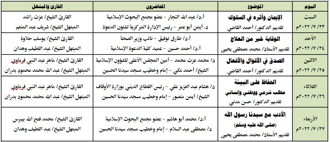 وأشارت الأوقاف، إلى أن الأسابيع الثقافية التي تطلقها الأوقاف ستتضمن تنوعا كبيرا من محاضرات لعلماء دين وكتاب ومفكرين مع تلاوات قرآنية وابتهالات دينية لكبار المقرئين والمبتهلين، وسيعقد الأسبوع الثقافي بين المغرب والعشاء يوميًّا من السبت إلى الأربعاء.