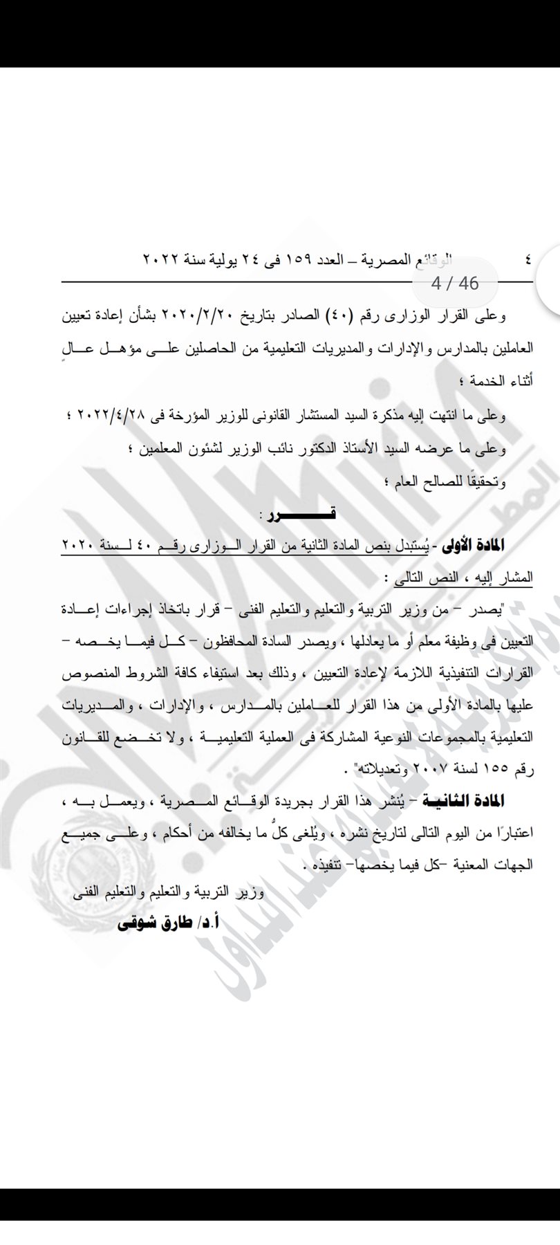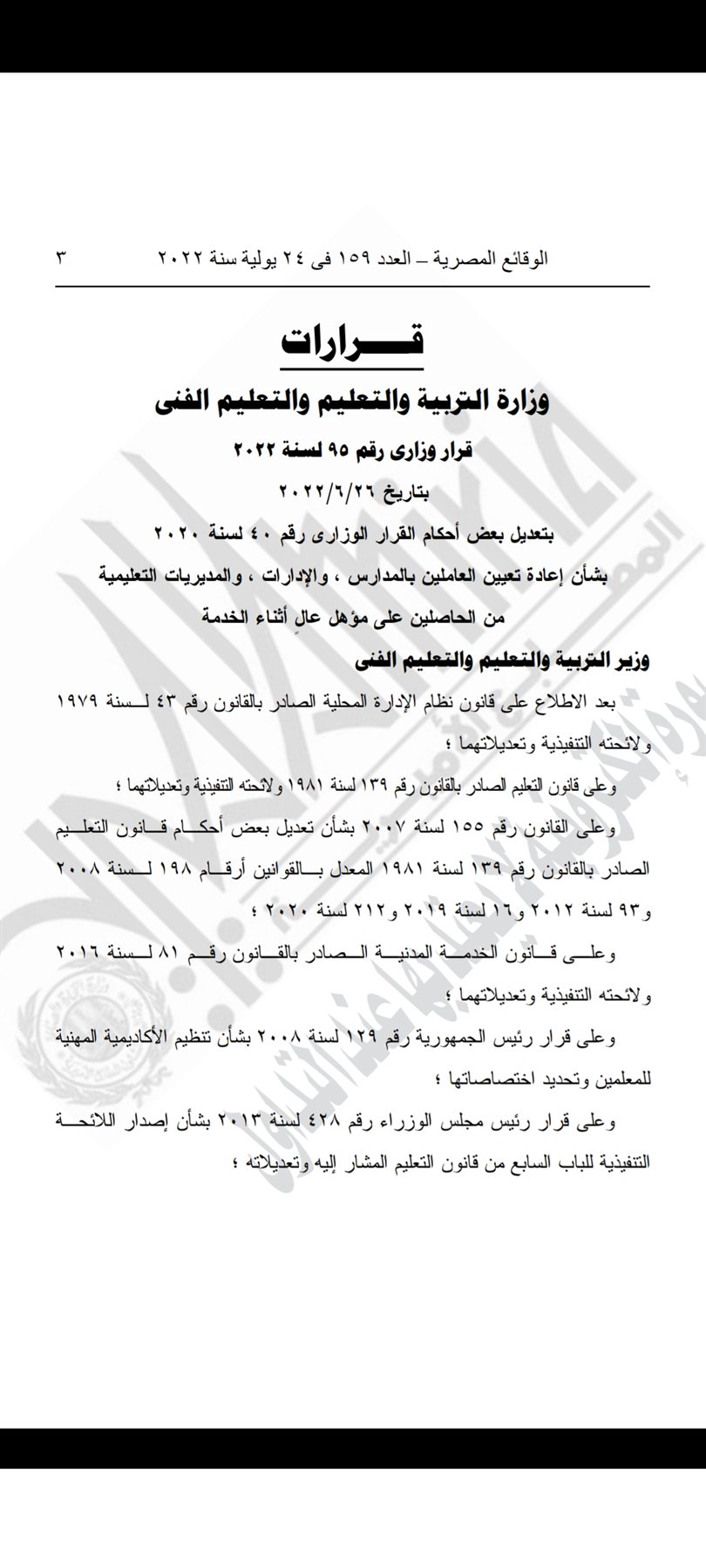 وأشارت الجريدة الرسمية، إلى أنه بعد الاطلاع على قانون نظام الإدارة المحلية الصادر بالقانون رقم 43 لسنة 1979، ولائحته التنفيذية وتعديلاتهما، وعلى قانون التعليم الصادر بالقانون رقم 139 لسنة 1981 ولائحته التنفيذية وتعديلاتهما؛ وعلى القانون رقم 155 لسنة 2007 بشأن تعديل بعض أحكـام قـانون التعلـيم، وعلى النص الصادر بالقانون رقم 139 لسنة 1981 المعدل بالقوانين أرقـام 198 لسنة 2008 و93 لسنة 2012، وعلى قـانون الخدمة المدنيـة الـصـادر بالقانون رقـم 81 لسنة 2016، وعلى القرار الوزاري رقم (40) الصادر بشأن إعادة تعيين العاملين بالمدارس والإدارات والمديريات التعليمية من الحاصلين علـى مؤهـل عـال أثناء الخدمة؛ وعلى ما انتهت إليه مذكرة المستشار القانوني للوزير وعلى ما عرضه الدكتور نائب الوزير لشئون المعلمين؛ وتحقيقا للصالح العام.