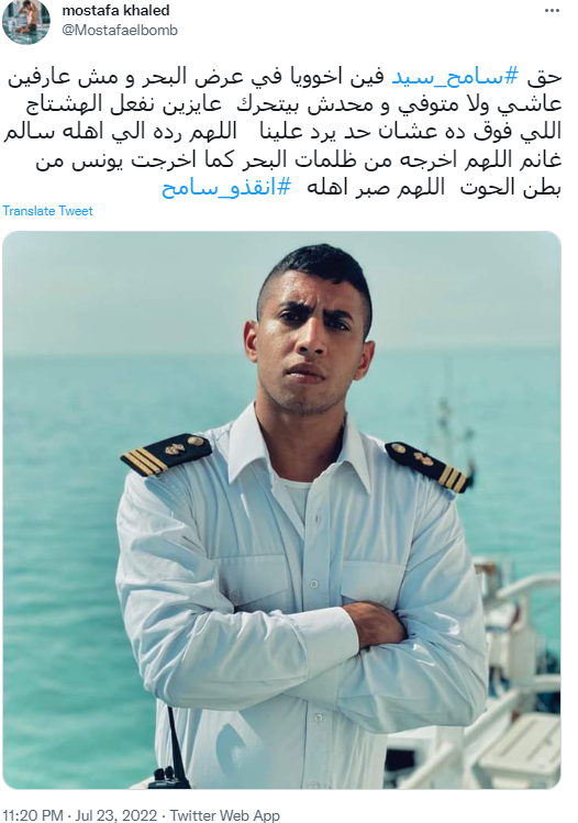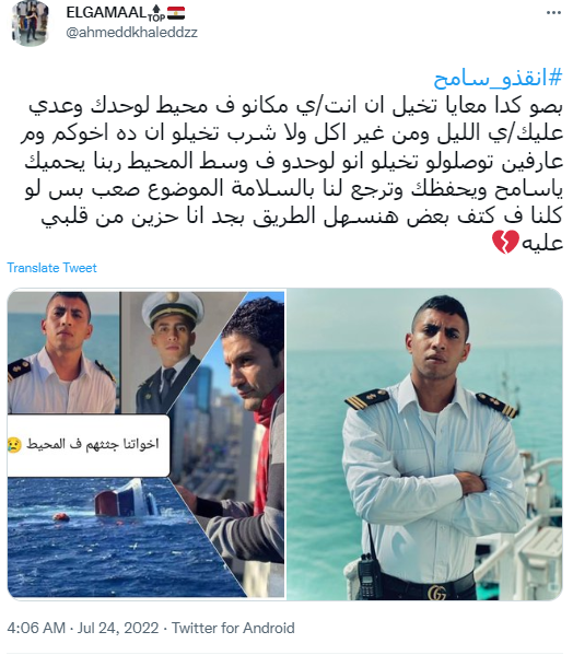 ونشر حساب آخر باسم مصطفى خالد، صورة سامح، وكتب عليها: حق سامح سيد فين أخويا في عرض البحر ومش عارفين عايش ولا متوفى، ومحدش بيتحرك عايزين نفعل الهشتاج اللي فوق ده عشان حد يرد علينا.. اللهم رده إلى أهله سالما غانما.. اللهم أخرجه من ظلمات البحر، كما أخرجت يونس من بطن الحوت.. اللهم صبر أهله.. أنقذوا سامح.