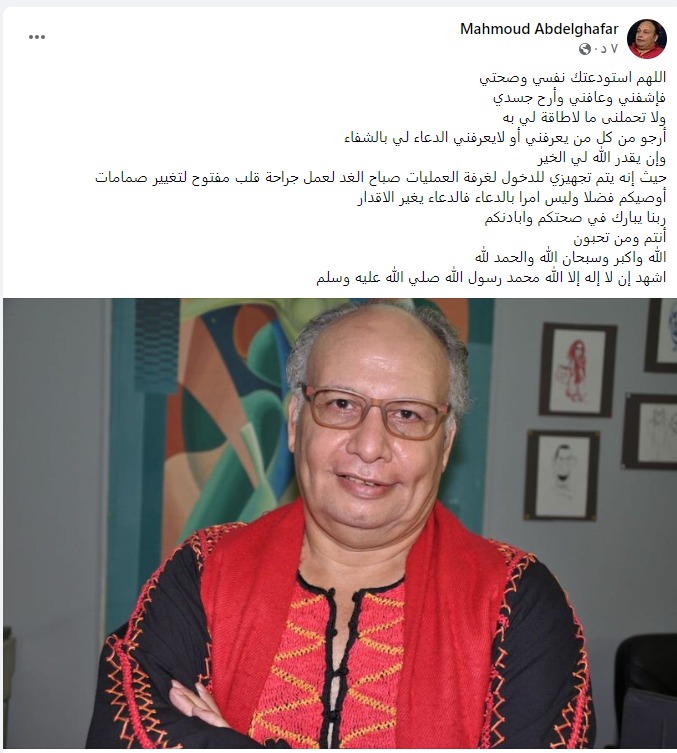 وأضاف محمود عبد الغفار: يتم تجهيزي للدخول لغرفة العمليات صباح الغد، لعمل جراحة قلب مفتوح لتغيير صمامات، أوصيكم فضلًا وليس أمرًا بالدعاء، فالدعاء يغير الأقدار، ربنا يبارك في صحتكم وأبادنكم أنتم ومن تحبون.