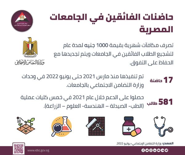 نشر مركز المعلومات التابع إلى مجلس الوزراء، انفوجراف، سلّط الضوء على حاضنات الفائقين في الجامعات المصرية، مشيرًا إلى أنها تهدف لتشجيع الطلاب الفائقين في الدراسة الجامعية بالسنوات المختلفة، من خلال صرف مكافآت تبلغ نحو 1000جنيه شهريًّا لمدة عام، يتم تجديدها في حالة الحفاظ على معدل التفوق.