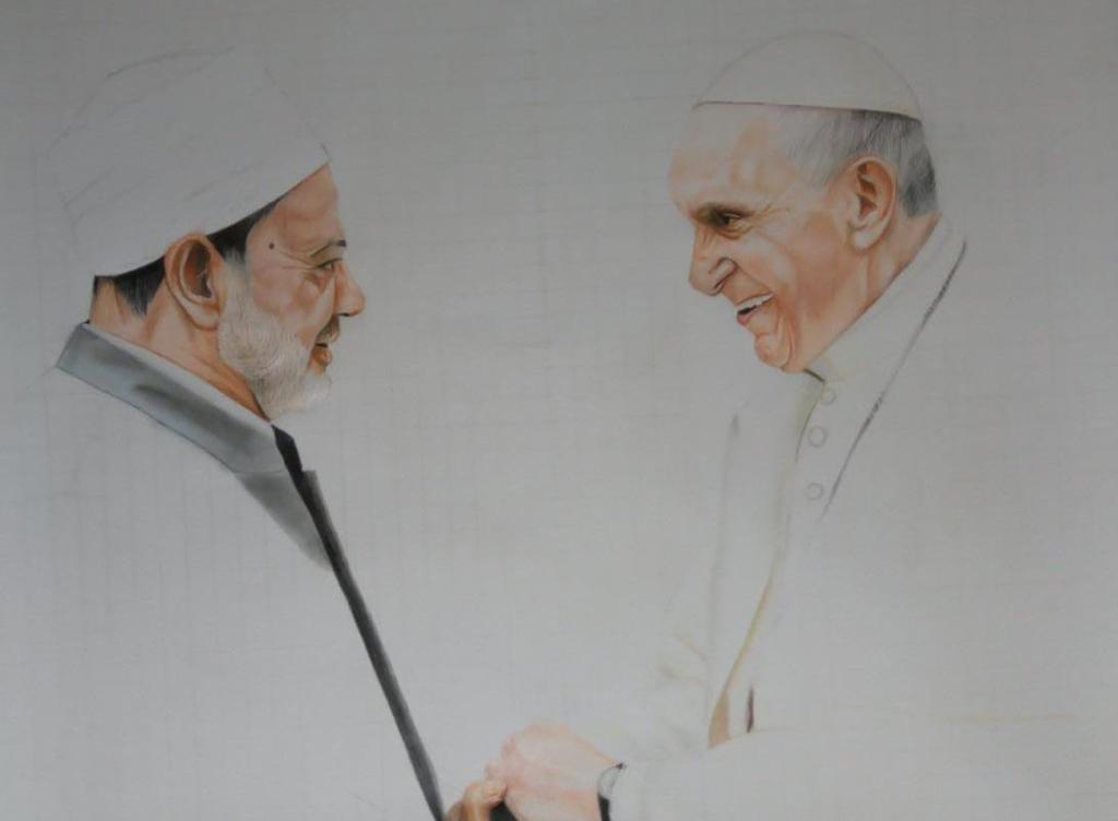 وأضافت أنها شاركت في معارض عدة بلوحات مختلفة، منها لوحة شيخ الأزهر وبابا الفاتيكان بمناسبة يوم الإنسانية، واستخدمت في تلوين اللوحة الألوان الخشبية، فضلا على وضع بعض اللمسات ومنها حمامتي السلام تعبيرا عن الحالة التي أرساها الرمزان بين الشعوب.