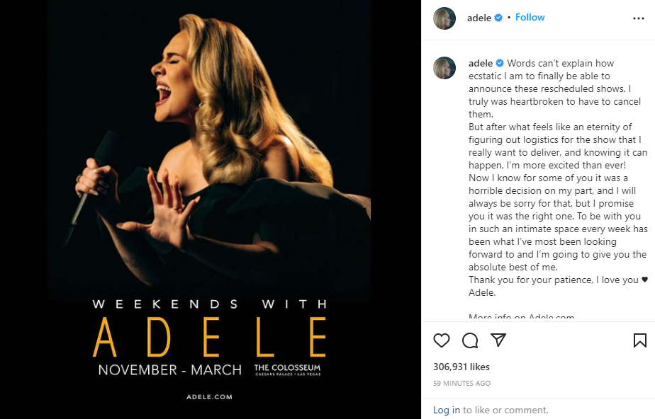 ونشرت أديل، صورة للحفلات عبر موقع تبادل الصور والفيديوهات انستجرام، وقالت: لا يمكن للكلمات أن تشرح مدى سعادتي لأن أتمكن أخيرًا من الإعلان عن هذه العروض المجدولة، لقد شعرت بالحزن الشديد لأنني اضطررت إلى إلغائها.