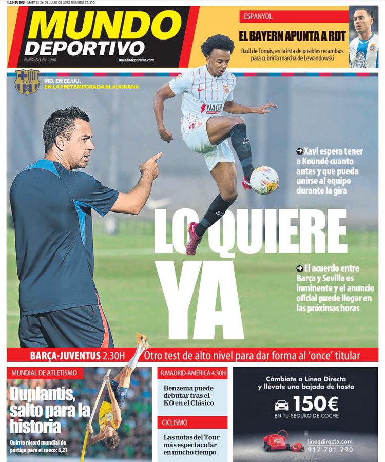 تصدر الفرنسي جول كوندي لاعب فريق إشبيلية الإسباني غلاف صحيفة موندو ديبورتيفو لعدد اليوم، حيث قالت إن تشافي يريده، ويأمل مدرب برشلونة في الحصول على كوندي بأسرع وقت ممكن، ليتمكن من الانضمام إلى جولة أمريكا.