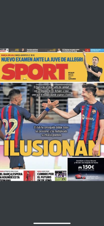 عنونت سبورت في غلافها لعدد اليوم بـ الوهم، حيث قالت إن برشلونة يحقق قفزة نوعية كبيرة مع وصول التعاقدات وتشافي يعتقد أن الفريق يمكن أن يطمح إلى أي شيء، كما تمكن فريق تشافي من مضاعفة جميع المراكز وضاعف كفاءته في التهديف.
