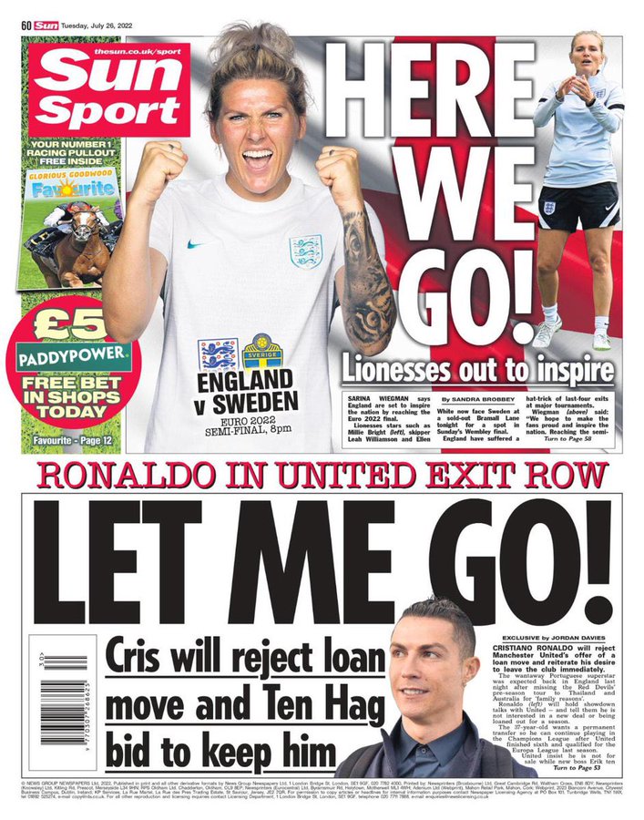 تصدر البرتغالي كريستيانو رونالدو لاعب فريق مانشستر يونايتد الإنجليزي غلاف ذا صن لعدد اليوم، حيث عنونت بـ دعوني أرحل، وقالت إن كريستيانو سيرفض عرض الإعارة وتين هاج مدرب مانشستر يونايتد يرغب بالإبقاء عليه.