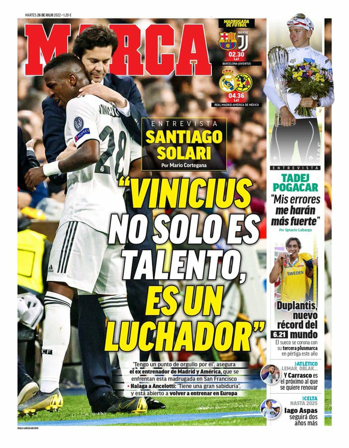 سلطت ماركا الضوء في غلافها على تصريحات سانتياجو سولاري مدرب ريال مدريد الإسباني السابق، حيث عنونت بـ سولاري: فينيسيوس ليس موهوبًا فقط، إنه مقاتل، وأشاد المدرب السابق للملكي بنجم الفريق الشاب.