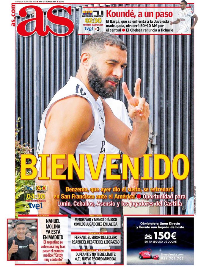 تصدر الفرنسي كريم بنزيما لاعب فريق ريال مدريد الإسباني غلاف صحيفة آس لعدد اليوم، حيث قالت الصحيفة إن بنزيما الذي أثار الذعر بسبب إصابته أمس، سيخوض أول مباراة له في سان فرانسيسكو ضد كلوب أمريكا.