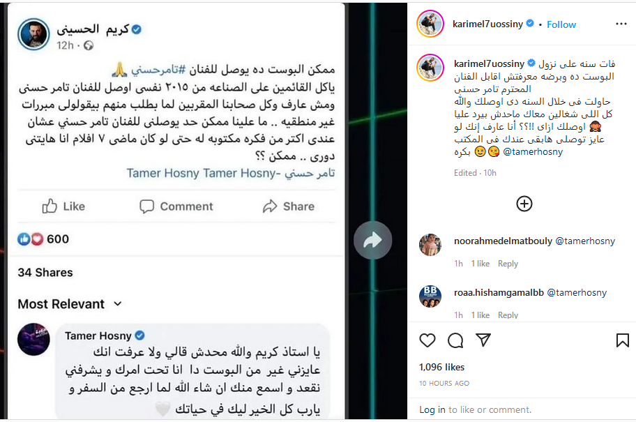 وشارك الفنان كريم الحسيني متابعيه منشورا له عبر حسابه الشخصي بموقع انستجرام، طلب من خلاله مقابلة تامر حسني من أجل العمل معه، قائلًا: فات سنة على نزول البوست ده وبرضه معرفتش أقابل الفنان المحترم تامر حسني، حاولت في خلال السنة دي أوصلك والله كل اللي شغالين معاك محدش بيرد عليا.