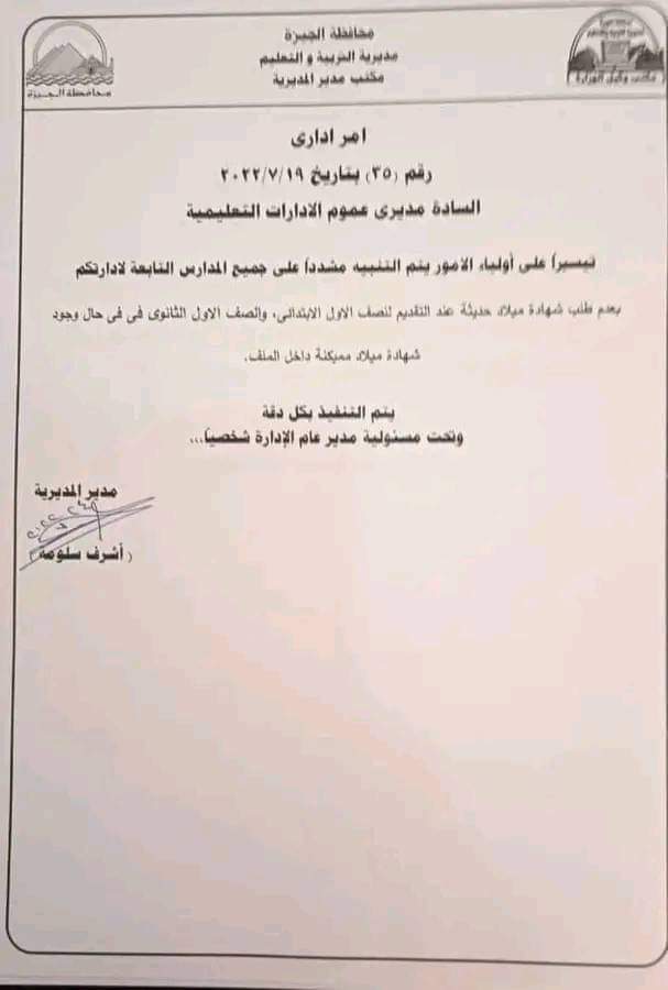 وحصل القاهرة 24، على صورة إخطار مدير تعليم الجيزة لمديري الإدارات، حيث ينص على أنه تيسيرًا على أولياء الأمور يتم التنبيه على جميع المدارس بالإدارات بعدم طلب شهادة ميلاد حديثة عند التقديم للصفين الأول الابتدائي والأول الثانوي، في حال وجود شهادة ميلاد مميكنة داخل الملف، على أن يتم التنفيذ بكل دقة وتحت مسئولية مدير عام الإدارة شخصيًا.