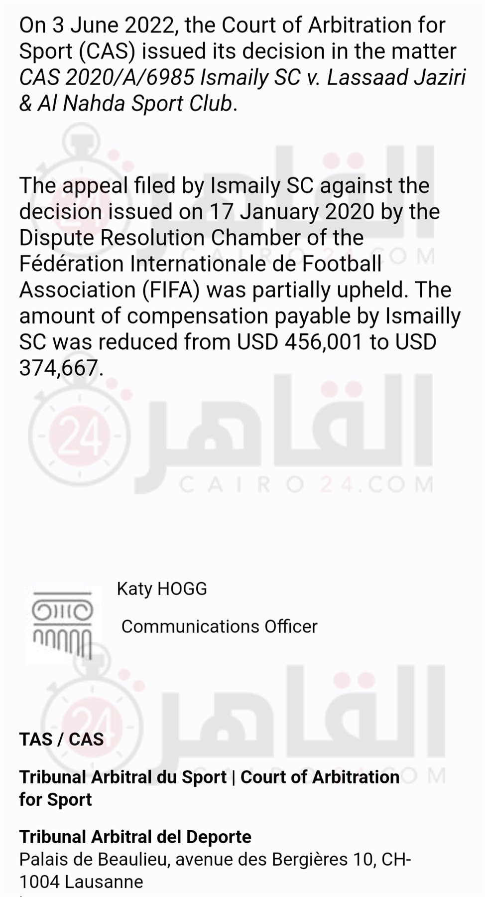 حصل القاهرة 24 على نص الحكم الصادر من جانب المحكمة الرياضية الدولية ضد النادي الإسماعيلي، بشأن الدعوى الذي رفعها التونسي لسعد الجزيري لاعب الفريق السابق، لعدم الحصول على مستحقاته.