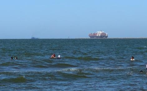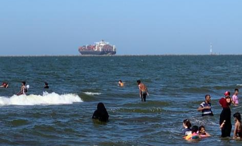 خطف صوت آلة تنبيه أحد السفن العملاقة العابرة لقناة السويس والمتجهة لـ غاطس البحر المتوسط قلوب المصطافين، خلال ممارستهم السباحة في شاطئ بورسعيد.