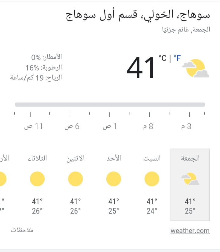 وبالنسبة لمحافظات جنوب الصعيد، (سوهاج، قنا، الأقصر، أسوان) فتسجل درجة الحرارة العظمى اليوم الجمعة 42 درجة مئوية، بينما تصل درجة الحرارة الصغرى خلال فترات المساء إلى 26 درجة مئوية.