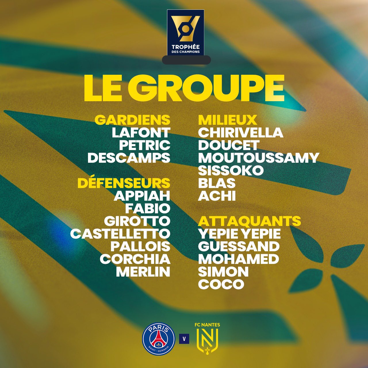 وشهدت قائمة باريس سان جيرمان لمواجهة نانت، غياب الفرنسي كيليان مبابي بسبب الإيقاف، في حين تواجد الأرجنتيني ليونيل ميسي والبرازيلي نيمار دا سيلفا.