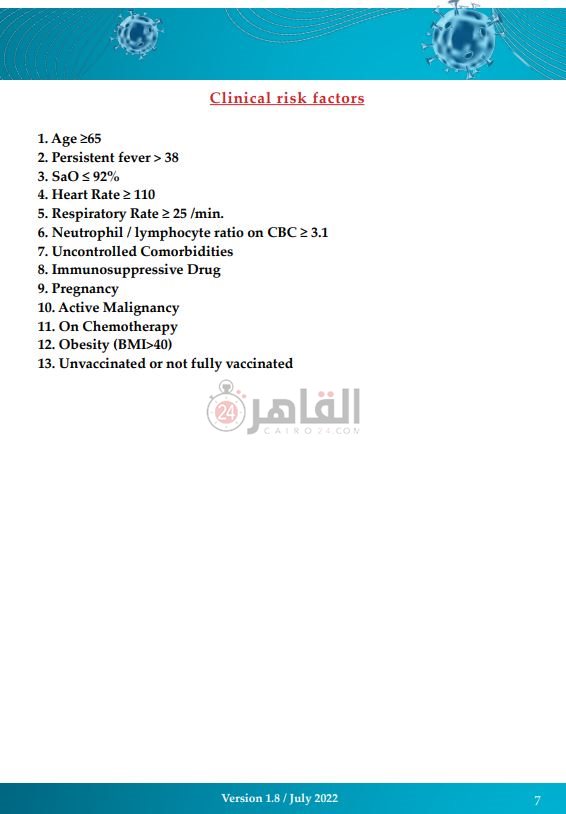 وتمثلت عوامل الخطر السريرية، وفقا لما نص عليه بروتوكول علاج كورونا الجديد، حصل القاهرة 24 على نسخة منه، أن يكون العمر أكبر من أو يساوي 65 عاما، حمى مستمرة عن 38 درجة، معدل ضربات القلب أقل من أو يساوي 110، ومعدل التنفس أقل من أو يساوي 25 في الدقيقة.
