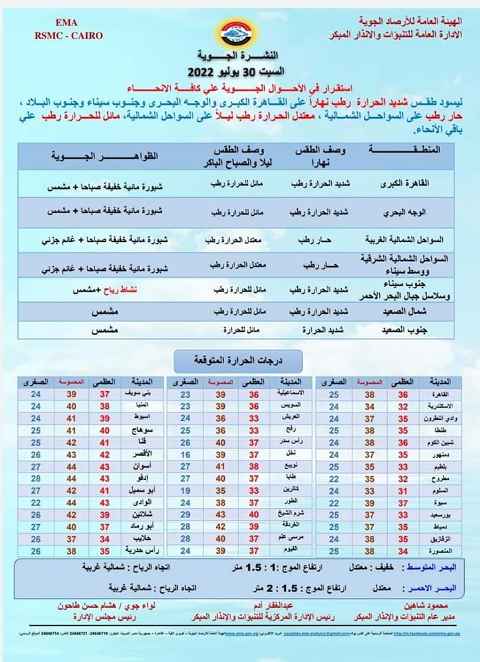 وأعلنت هيئة الأرصاد درجات الحرارة المتوقعة غدا، حيث جاءت كالآتي: