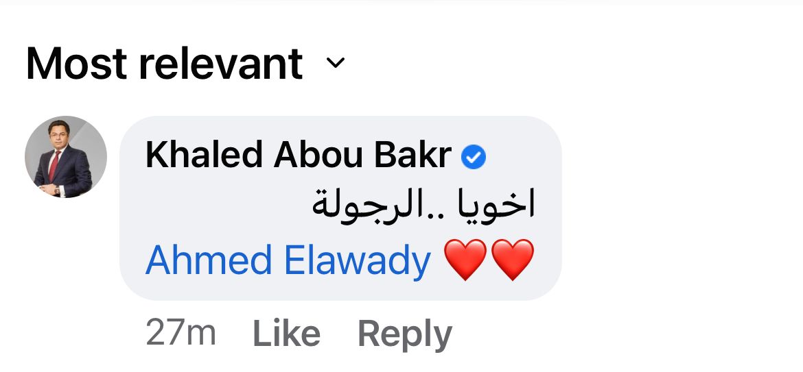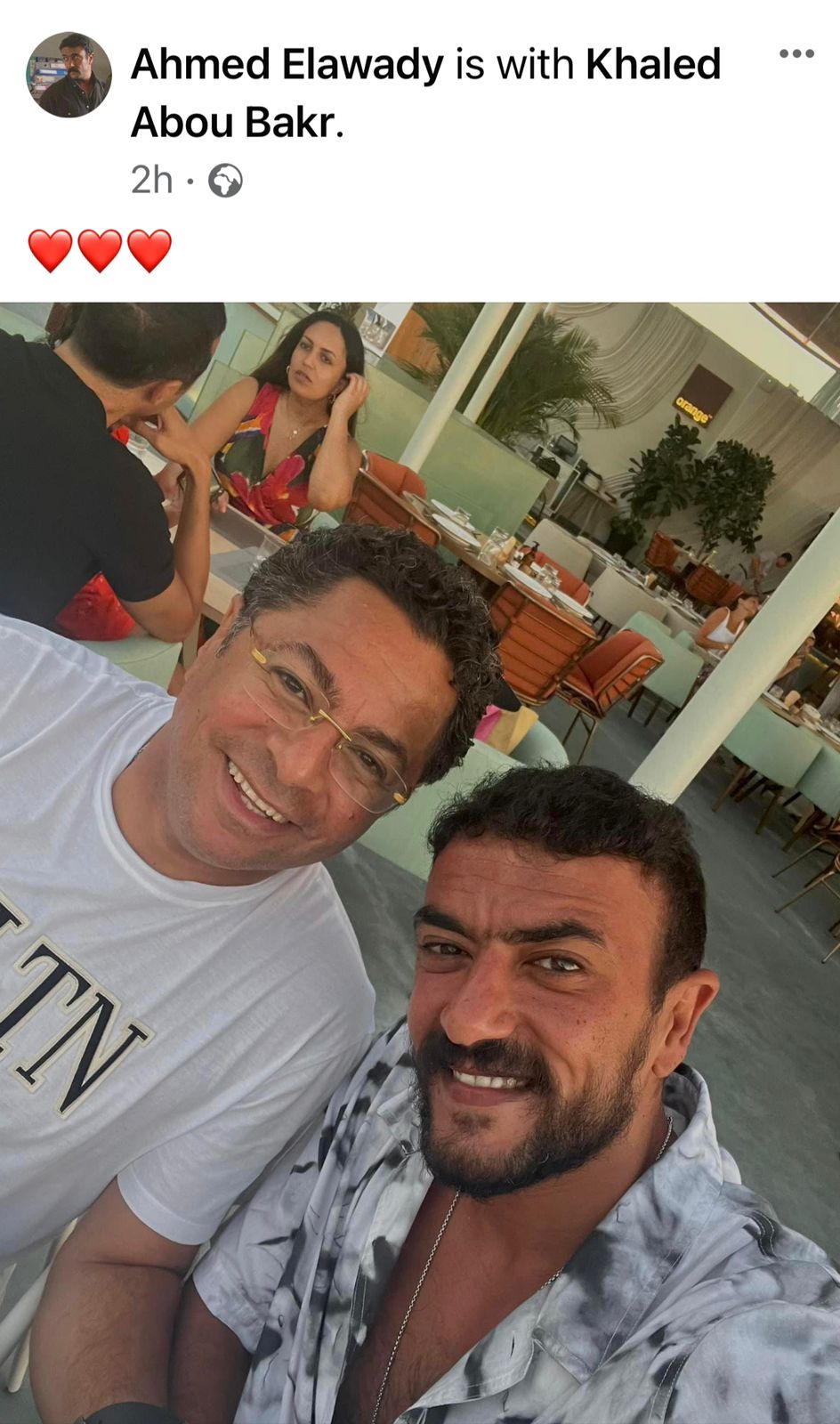 شارك الفنان أحمد العوضي صورة تجمعه بالمحامي الدولي خالد أبو بكر، وذلك عبر حسابه على موقع فيسبوك، إذ تجمعهما علاقة طيبة على المستوى المهني والشخصي.