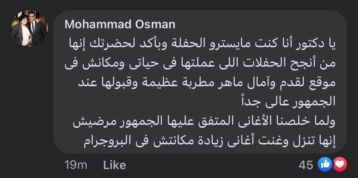 وتحدث محمد عثمان عن نجاح الحفل، من خلال تعليقه على منشور كتبه المنتج محمد العدل عن حفل آمال ماهر على حسابه الشخصي بموقع التواصل الاجتماعي فيسبوك، إذ قال: أنا كنت مايسترو الحفلة وبأكد لحضرتك إنها من أنجح الحفلات، اللي عملتها في حياتي ومكانش في موضع لقدم، وآمال ماهر مطربة عظيمة وقبولها عند الجمهور عالي جدًا.