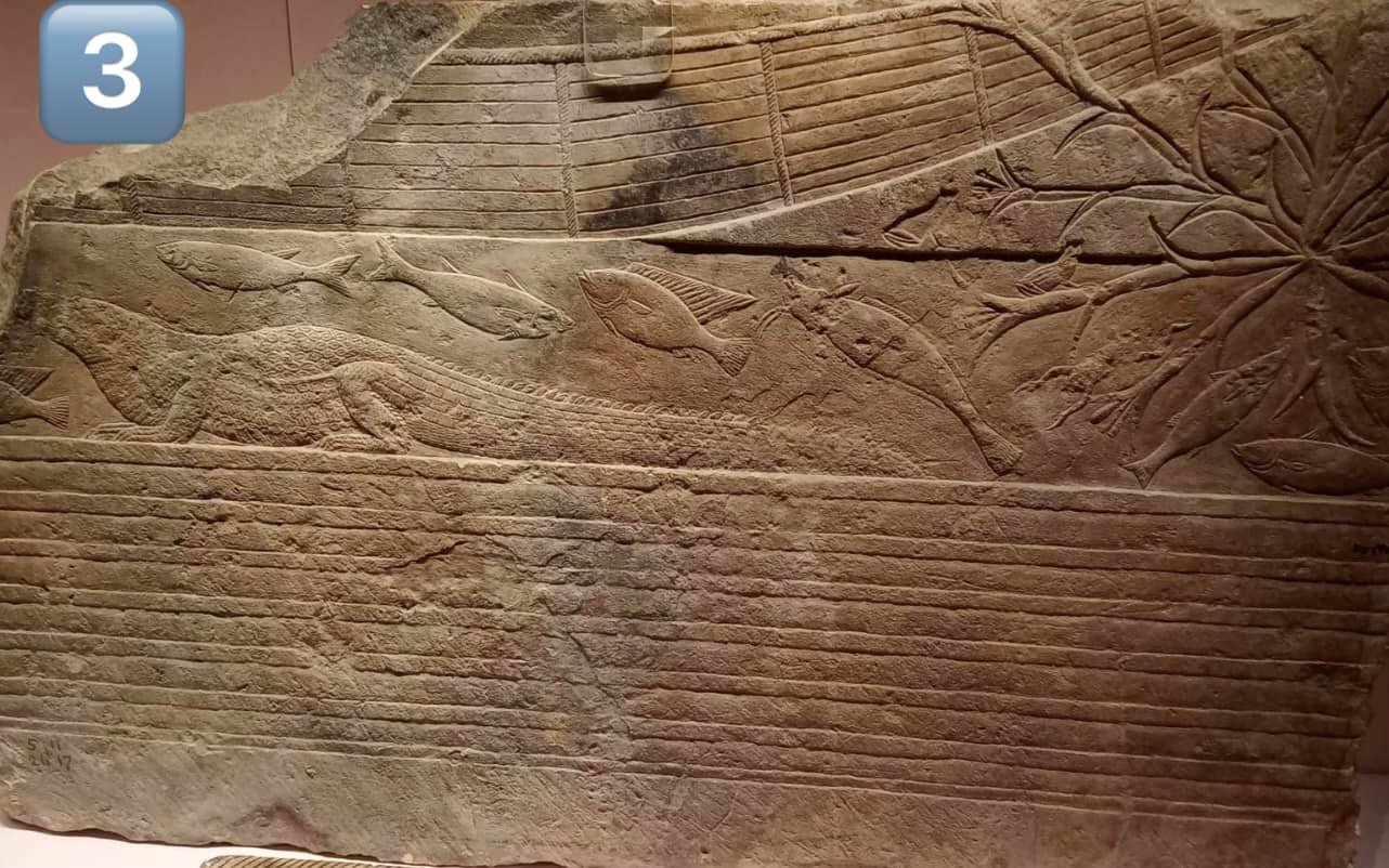 والقطعة الثالثة عبارة لوحة حجرية منقوش عليها رسم لأسماك بنهر النيل وتمساح ونباتات نيلية، ويسبح أعلاهم قارب لصيد الأسماك وقد سجل المصريون القدماء العديد من مشاهد الحياة اليومية على جدران المقابر، والتي توضح أهمية النهر في استخدامه كوسيلة مواصلات للانتقال بين المدن والتجارة ونقل البضائع والمراسم الجنائزية في نقل المتوفى من الشرق إلى الضفة الغربية لنهر النيل ليدفن بالمقابر وإقامة الصلوات الجنائزية بالمعابد الجنائزية بالغرب.