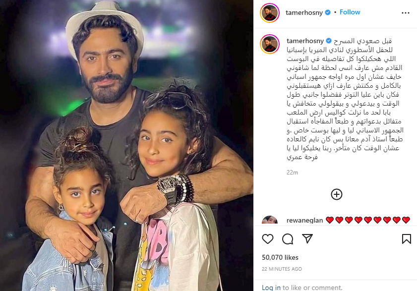 ونشر تامر حسني عبر حسابه الرسمي بـ انستجرام صورة له مع بنتيه قائلا: قبل صعودي المسرح للحفل الأسطوري لنادي الميريا بإسبانيا اللي هحكيلكوا كل تفاصيله في البوست القادم، مش عارف أنسى لحظة لما شافوني خايف عشان أول مرة أواجه جمهور أسباني بالكامل.