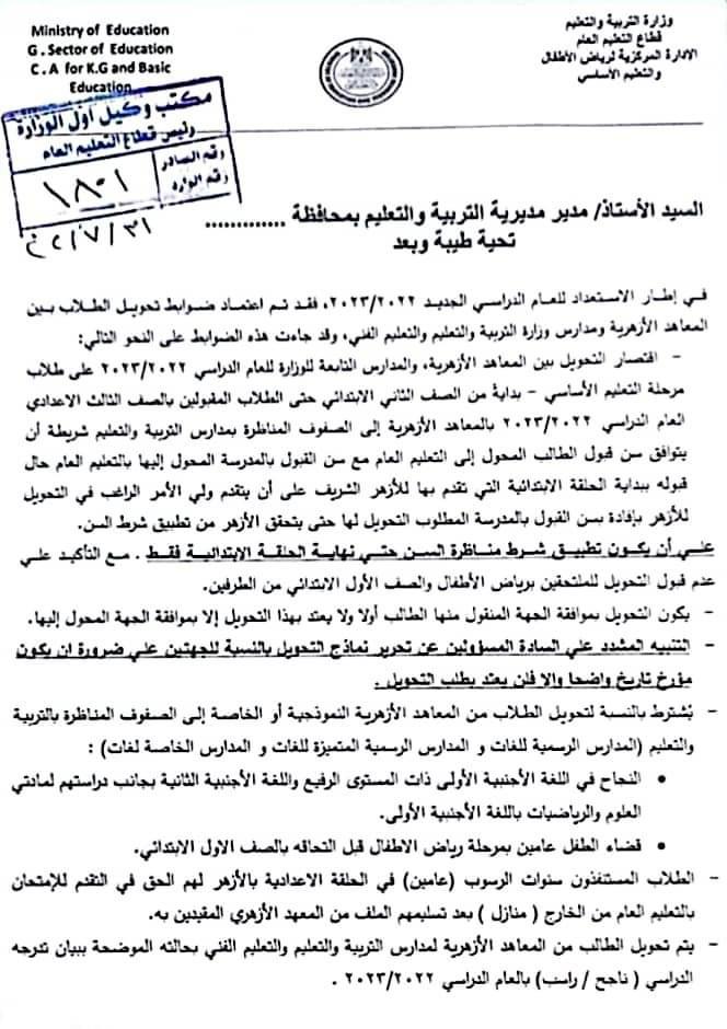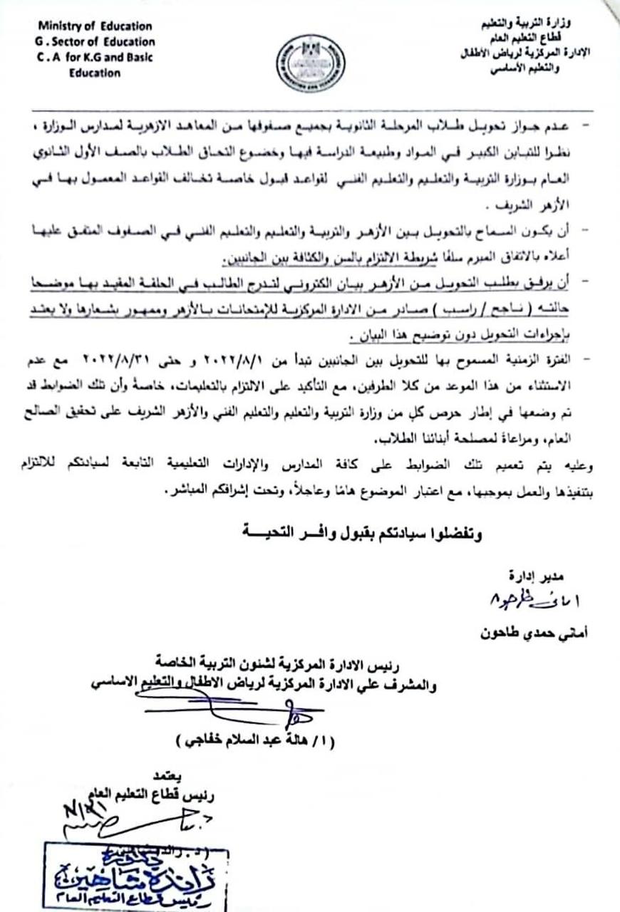 فيما أعلنت وزارة التربية والتعليم والتعليم الفني، ضوابط تحويل الطلاب بين المعاهد الأزهرية ومدارس وزارة التربية والتعليم والتعليم الفني، وذلك في الفترة من 1 إلى 31 أغسطس 2022، للعام الدراسي 2022/2023.