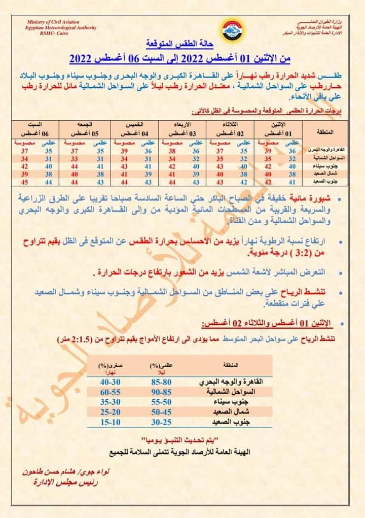 كشفت الهيئة العامة للأرصاد الجوية، حالة الطقس بداية من اليوم الاثنين الموافق 1 أغسطس 2022، حتى السبت المقبل، موضحة أبرز الظواهر الجوية المتوقعة خلال تلك الفترة.