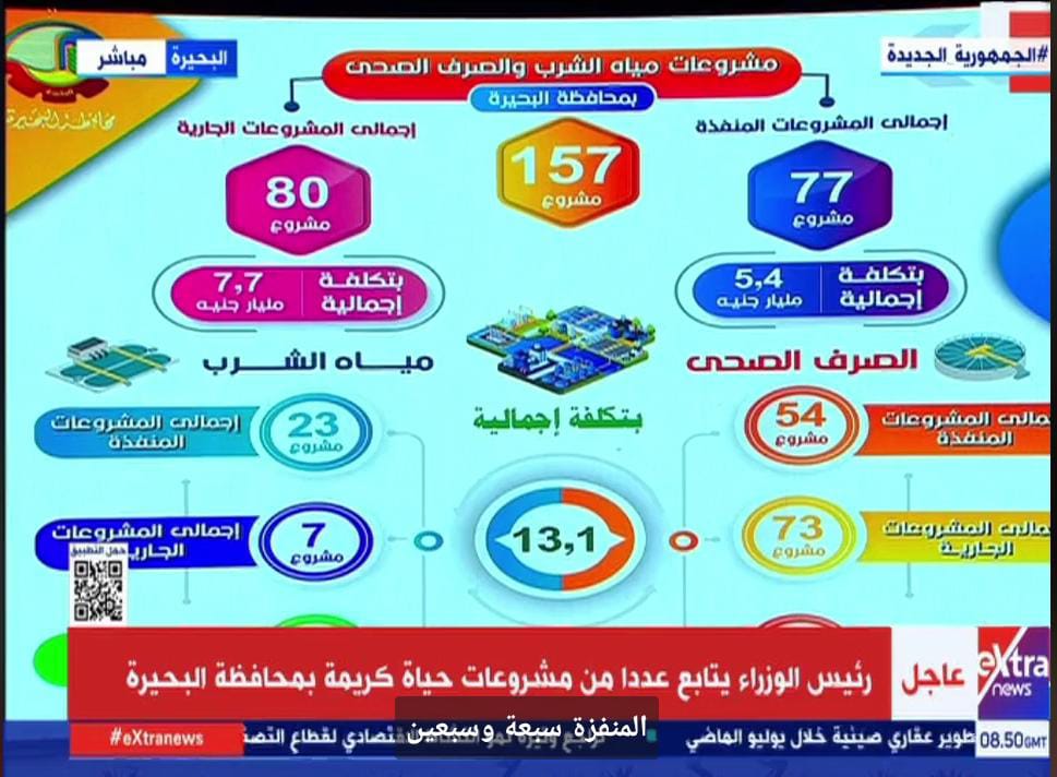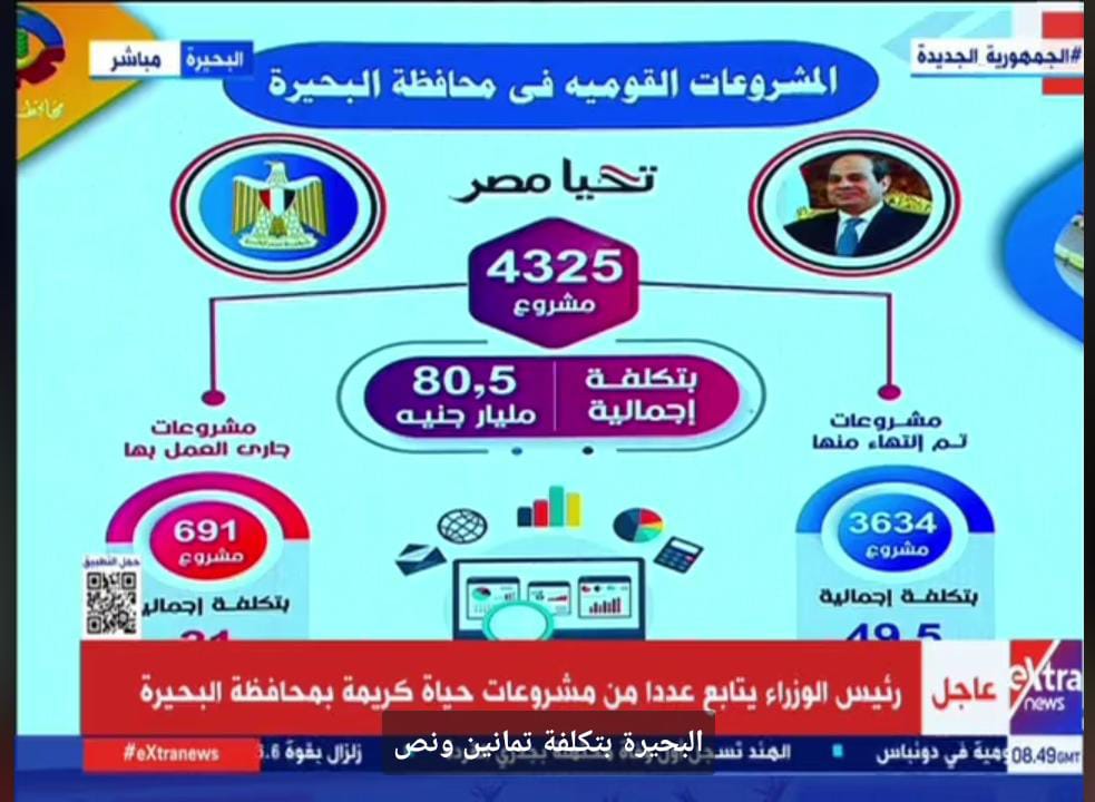 وأضاف محافظ البحيرة، خلال استعراض المشروعات القومية ومشروعات المبادرة الرئاسية حياة كريمة في حضور رئيس الوزراء، أنه تم الانتهاء من 3635 مشروعا بتكلفة إجمالية 49 مليار جنيه بنسبة تنفيذ 60%، وجار العمل بـ 691 مشروعا بتكلفة إجمالية 31.5 مليار جنيه، بنسبة 40 % في القطاعات المختلفة بالمحافظة، فضلا عن مشروعات حياة كريمة التي تكلف تنفيذها 44 مليار جنيه.