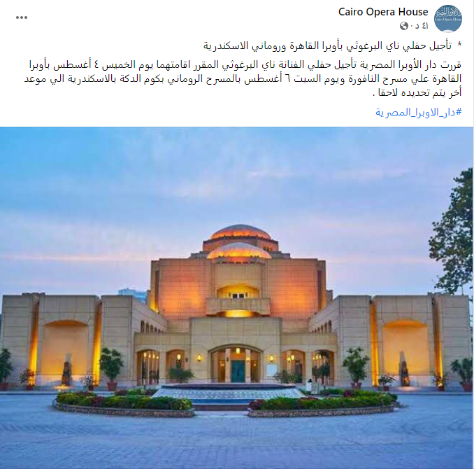قررت دار الأوبرا المصرية تأجيل حفلي الفنانة الفلسطينية ناي البرغوثي، المقرر إقامتهما يوم الخميس 4 أغسطس بأوبرا القاهرة على مسرح النافورة، ويوم السبت 6 أغسطس بالمسرح الروماني بكوم الدكة بالإسكندرية، إلى موعد آخر يتم تحديده لاحقا.