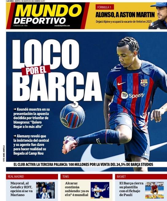 تصدر الفرنسي جول كوندي لاعب فريق برشلونة الوافد الجديد غلاف موندو ديبورتيفو لعدد اليوم، حيث عنونت بـ كوندي مجنون بنادي برشلونة، وقالت إنه أظهر في تقديمه التزامه الراسخ بالنجاح في النادي بتصريحه: أريد الوصول إلى القمة.