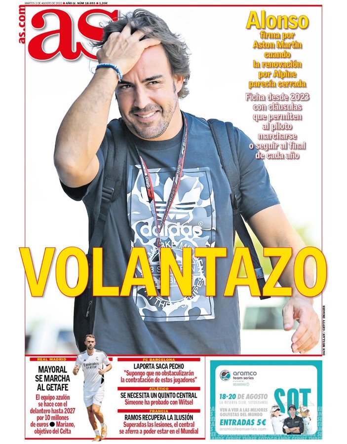سلطت آس الضوء في غلافها اليوم على رحيل مايورال عن ريال مدريد، حيث قالت إن مايورال ينضم إلى خيتافي حتى عام 2027 مقابل 10 ملايين يورو.