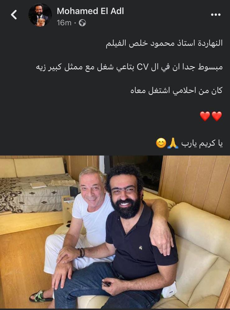 ونشر ماندو العدل على حسابه الرسمي بموقع التواصل الاجتماعي فيسبوك صورة تجمعه مع الفنان محمود حميدة، وعلق عليها: النهاردة أستاذ محمود خلص الفيلم، مبسوط جدًا أن في السيرة الذاتية بتاعتي شغل مع ممثل كبير زيه، وكان من أحلامي اشتغل معاه يا كريم يارب.
