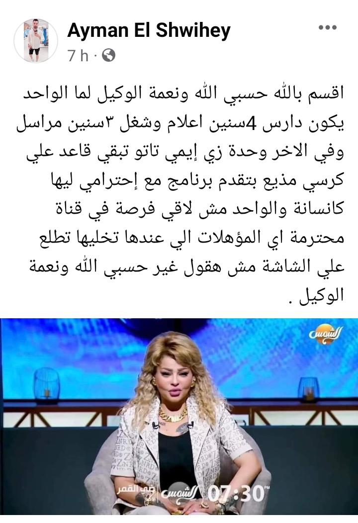وقال آخر: أقسم بالله حسبي الله ونعم الوكيل، لما الواحد يكون دارس 4 سنين إعلام وشغل 3 سنين مراسل وفي الآخر واحدة زي إيمي تاتو تبقى قاعد على كرسي مذيع بتقدم برنامج، مع احترامي ليها كإنسانة، والواحد مش لاقي فرصة في قناة محترمة.. إيه المؤهلات اللي عندها تخليها تطلع على الشاشة، مش هقول غير حسبي الله ونعمة الوكيل.