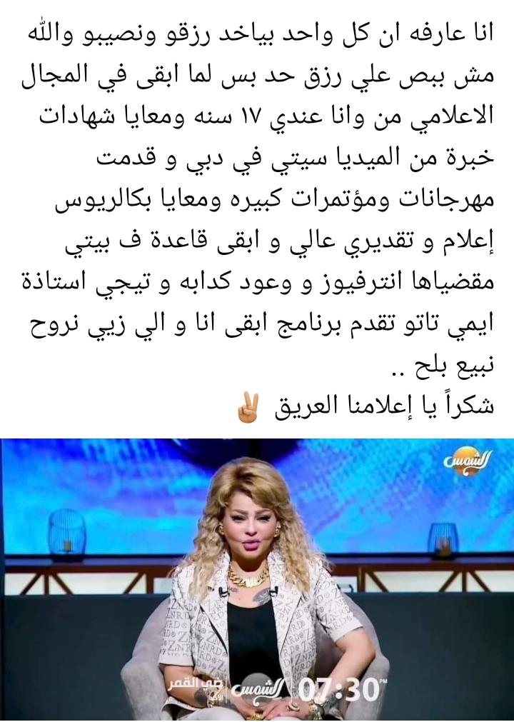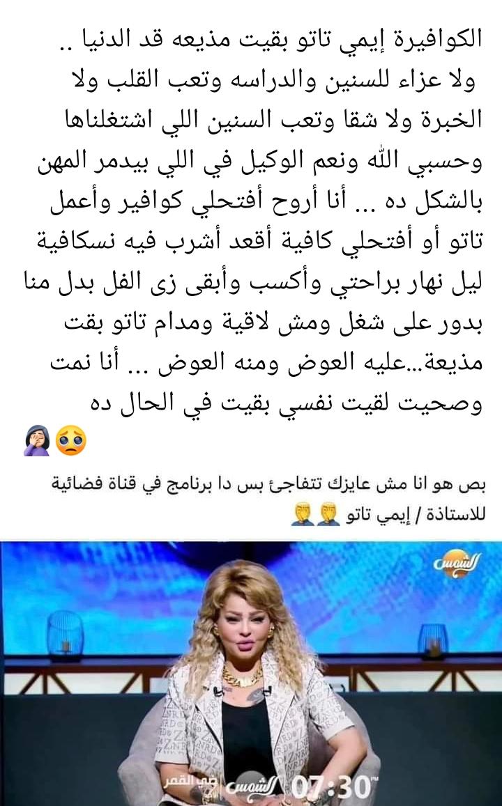 وكتبت إحدى الفتيات عبر فيسبوك: الحمد لله الذي بنعمته تتم الصالحات، إيمي تاتو بقيت مذيعة قد الدنيا، ولا عزاء لسنين الدراسة وتعب القلب ولا الخبرة ولا شقا وتعب السنين، وحسبي الله ونعم الوكيل في اللي بيدمر الشغلانة بالشكل ده.